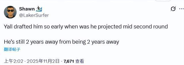 球迷Shawn写道:“你们当初选他选得也太早了吧——之前预测他也就第二轮中段才能被选中。他现在的水平,就算再等两年,距离能打出来也还得再等两年。”