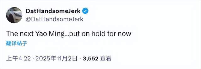 球迷DatHandsomeJerk写道:“下一个姚明…… 目前只能暂时搁置。”